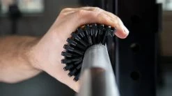 The brush was developed by accomplished Strongman and CrossFit competitor/coach Rob Orlando of Hybrid Athletics (see also: The Rogue Axle, Rogue Farmers Walk Handles, and Hybrid Stone Molds). In his own gym, Rob uses the 360° Brush after every use of a barbell, pull-up bar, KB, or DB. “Once you scrub the gear for the first time,” he says, “ which will remove years of grit, maintenance cleaning is simple and will require significantly less muscle. In an effort to keep things sanitized we spray our bars with disinfectant after they’ve been cleaned. Occasionally we rub them with a 3-in-1 oil as well.”