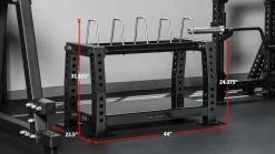 Creating a total footprint of 44” x 23.5”, the Monster Bumper Rack also gives gym owners the ability to store and organize any size/type of plate as they please, simply by repositioning the (5) stainless steel dividers along the 1” spaced holes in the railway tubing. Each unit comes with all required 1” hardware for set-up, along with laser-cut Rogue branding, an MG Black powdercoat finish, and a set of foot plates with ½” diameter holes (should you wish to mount the rack to the floor).