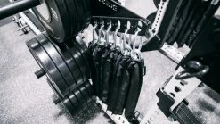 The Rogue Monster Chain Hanger is a bolt-on attachment designed exclusively for use with our 3×3” Monster Series racks and rigs. Constructed from 0.25” thick laser-cut and formed steel, the hanger is designed with a jog bend in the bracket, ensuring the superior strength needed to hold heavy lengths of chain. With a total of (6) 1” wide laser-cut carabiner slots, this simple rack add-on offers any gym a dependable, accessible, and organized new solution for multiple chain storage.