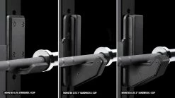 - Our premier model; the side plates fit into a recessed, machined plastic core (2″ wide) to stop metal-to-metal contact. The hardware (that connects the plastic to the side plates) is also recessed, preventing the bar or a user’s hand from scraping against them. Welds are inside the side plates for a clean edge, and UHMW plastic is featured on the clasp and back plate to prevent damage to the uprights.