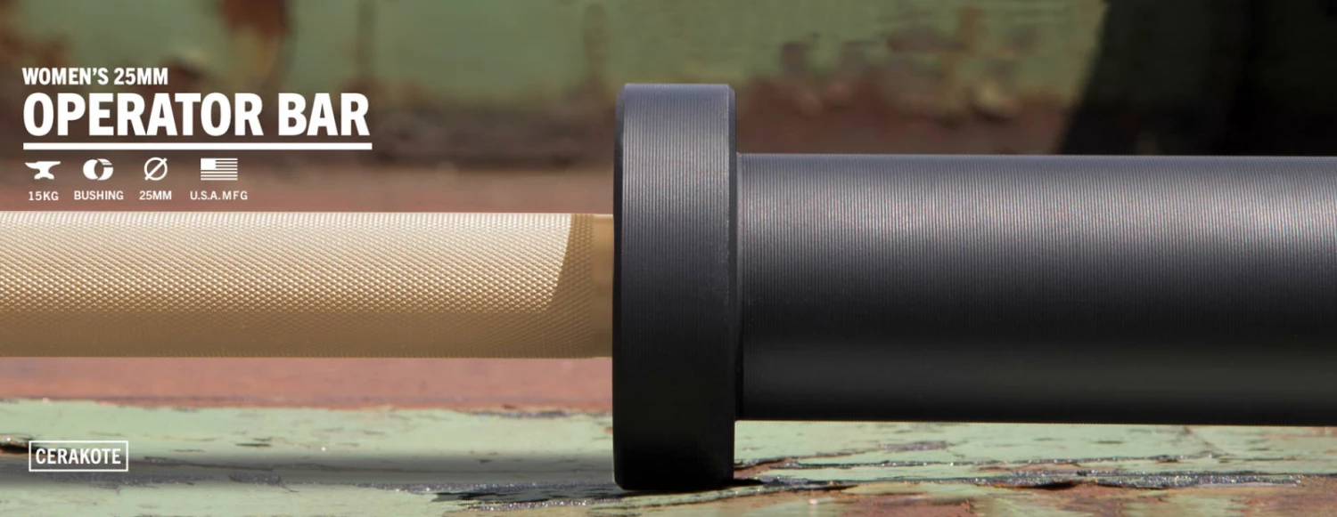 The 25MM Women’s Operator Bar is made from 190,000 PSI tensile strength steel and finished in an ultra-durable Cerakote coating. Fully machined and assembled in Columbus, Ohio, this versatile 15KG barbell also includes dual knurl marks (for Olympic and powerlifting), bronze bushings, and Rogue branding right on the center of the shaft.
