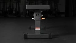 Importantly, this storage-friendly design has required no sacrifices on the manufacturing end, as the Fold-Up Utility Bench still offers the same solid foundation as our standard Flat Utility Bench, with a 2×3” 11-gauge steel frame and rubber feet to protect your flooring and prevent sliding. The wide-set leg angle is also retained for superior stability, while the (2) orange-handle detent pins make it easy to lock the bench legs in either the unfolded or folded position.