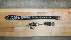 Rogue’s heavy-duty nylon lanyard includes a secure, detachable plastic buckle and a metal hook for attaching a set of keys, an ID card, a whistle, etc. The Rogue logo is featured down the full length of the lanyard in white on black.