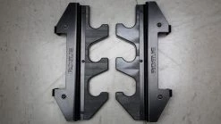 Each bracket includes special 1″ machined pegs (spaced 10″ on center) with a grooved design that allows them to drop and lock-in to the keyholes on the side of a Monster upright. There is also a stabilizing tab on the back of each bracket with a pre-installed velcro loop to protect the powdercoat of the upright.