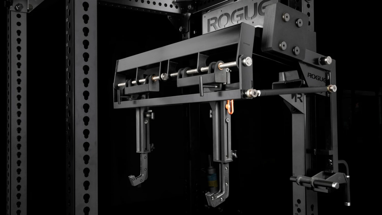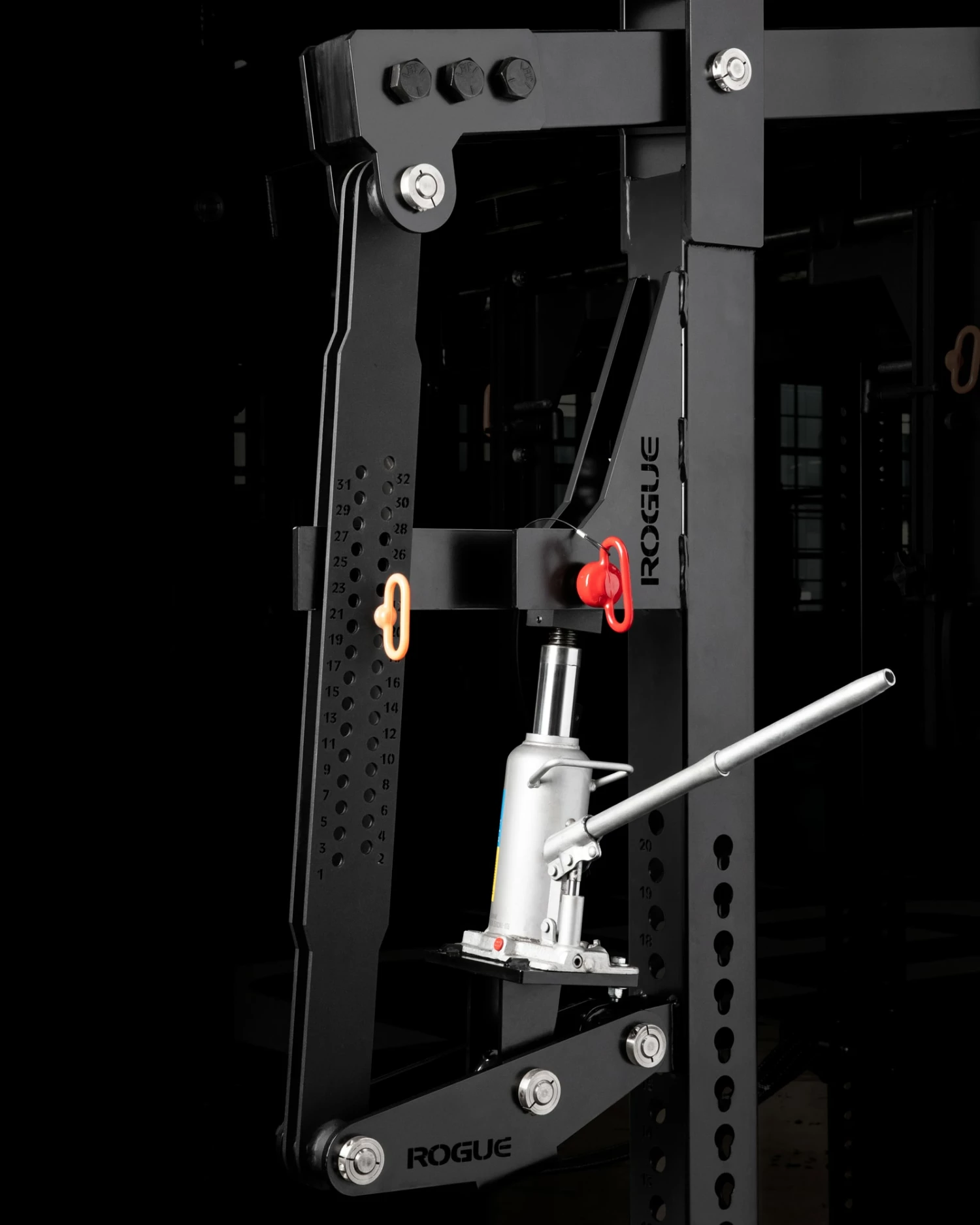 The precision monolift system on the RM44-4MONO is adaptable to athletes of any height, offering 32 incremental, hydraulic-assisted vertical adjustments, and counter-balanced lever arms with heim joint micro adjustments. When the athlete lifts a barbell off the Monolift, their spotter can then release the counter balance lock and pull a handle to swing the hooks out of their starting position and away from the athlete. This spacing creates a means of performing heavy-weight squats and bench press without having to walk or swing the bar out from the rack. It also enables safe re-racking, as the slanted angle of the unloaded hooks makes it easy to guide the bar in after the spotter returns the Monolift to its original position.