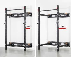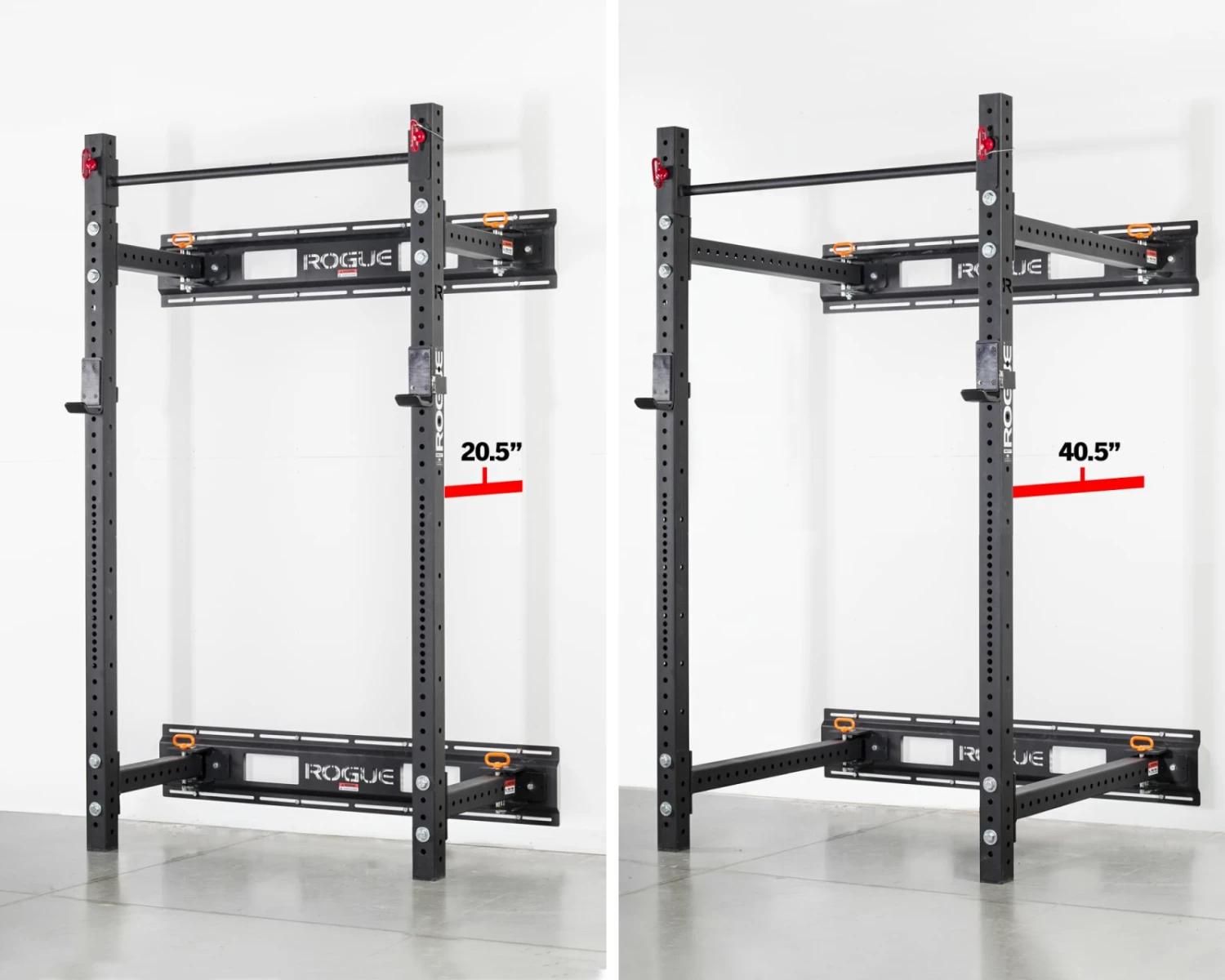 The design challenge was to come up with a wall-mount unit that could be folded inward or outward for space savings, yet still offer the sturdiness of our standard Monster Lite racks. To achieve this, our engineering team developed a unique hinge-and-pin system that is both easy to install and rock solid. In use as a squat stand, pull up rig, or power rack, the feel is miles beyond lighter setups that use thinner steel.