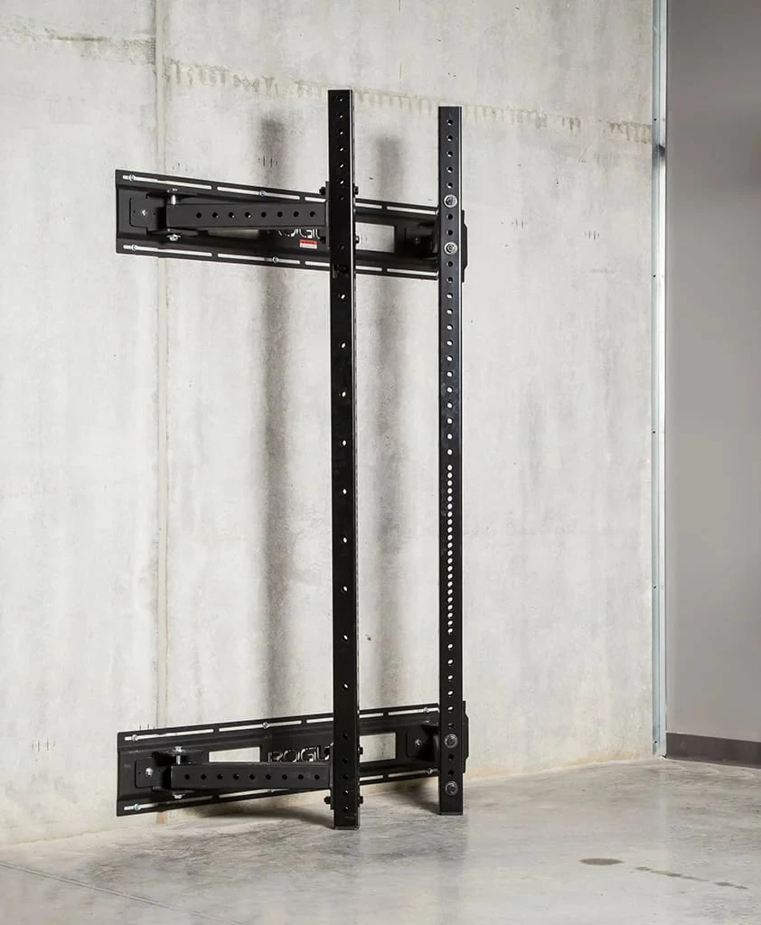 The central design challenge with the Fold Back Rack was to come up with a wall-mount unit that could be folded inward or outward for optimal space efficiency, yet still offer the sturdiness of our standard Monster Lite power racks. To achieve this, our engineering team developed a unique hinge-and-pin system that is both easy to install and rock solid. In use as a squat stand, pull up rig, or power rack, the feel is miles beyond lighter fold-back setups that use thinner steel.