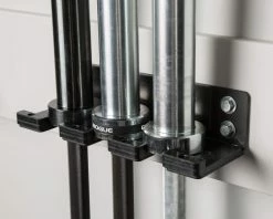 Available as a single-bar or triple-bar storage accessory, the compact Rogue Vertical Bar Hanger is made in the USA from 0.1875″ thick laser cut and formed steel, with a Protective UHMW plastic layer lining. Rather than sliding a barbell sleeve-first into a tube on the floor—like most standard vertical bar holders—this unit allows you to set up a wall-mounted or rack-mounted hanger that can store your bars efficiently above the ground, limiting the risk of any wear and tear during regular stowing and removal.