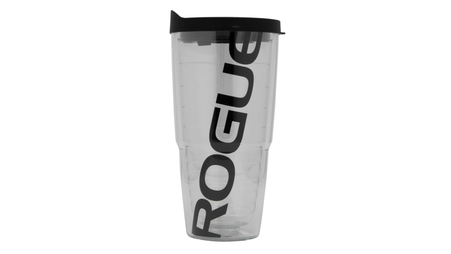 This exclusive Rogue edition of the 24 ounce Tumbler is a clear container with the Rogue logo printed up and down the length of the bottle in black. A seal-tight travel lid is included.