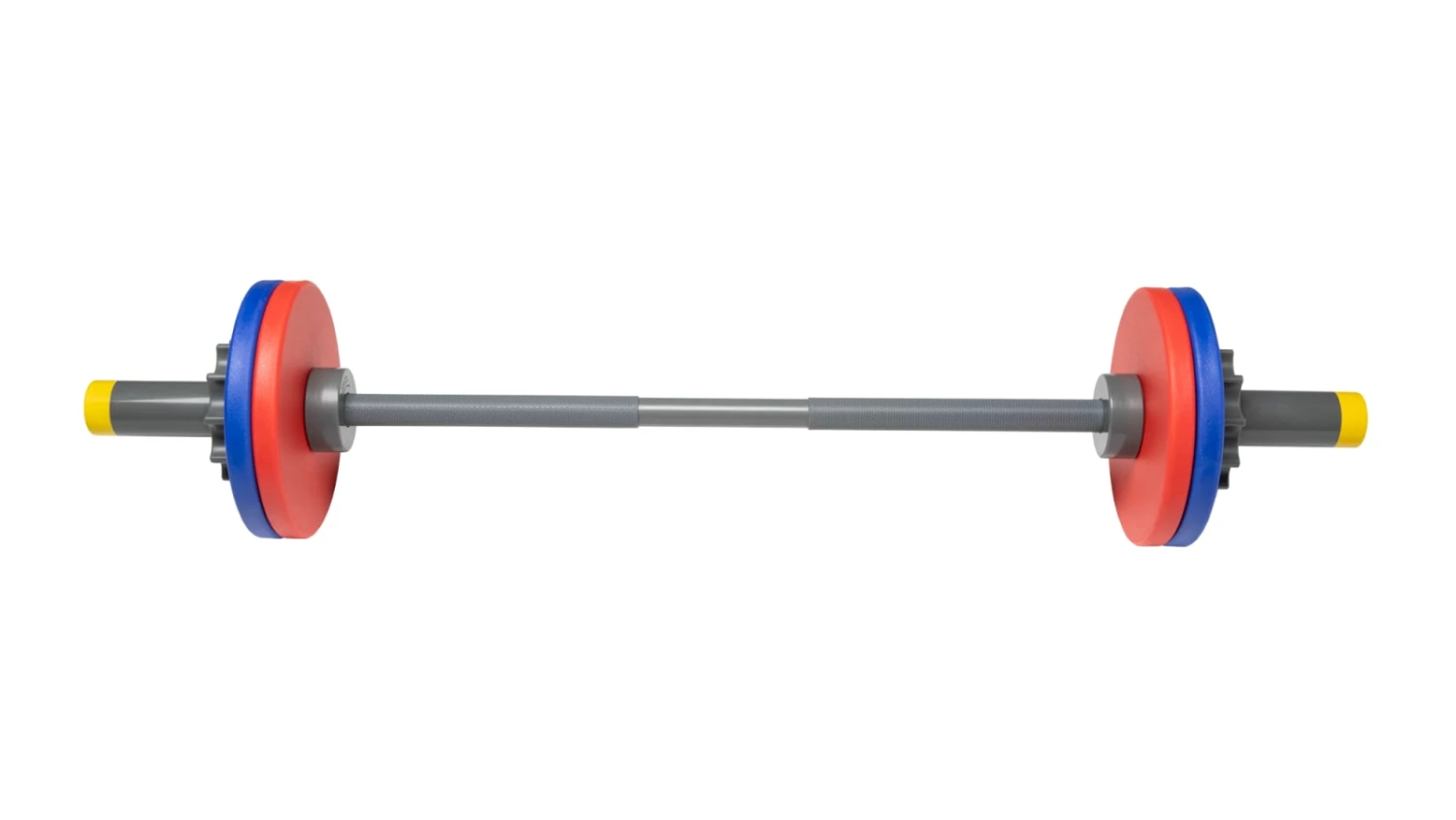The 36” long, 2.2LB Barbell Mini comes standard with four loadable plastic plates (two red, two blue) and two collars. Additional plates (sold at an added cost) can be loaded to reach a maximum capacity of 12 plates per bar.